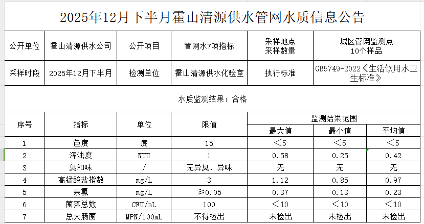 2025年12月下半月霍山清源供水管网水质信息公告