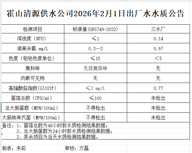 霍山清源供水公司2026年2月1日出厂水水质公告