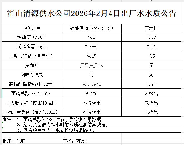 霍山清源供水公司2026年2月4日出厂水水质公告